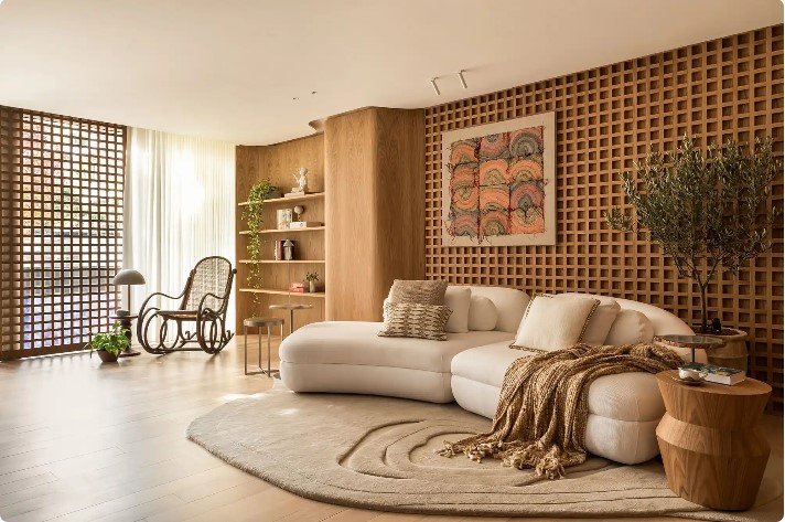 Essas cores transmitem a sensação de abrigo e pertencimento, suavizando o olhar e reduzindo estímulos visuais excessivos, o que transforma os espaços em refúgios afetivos.
