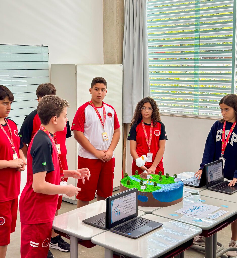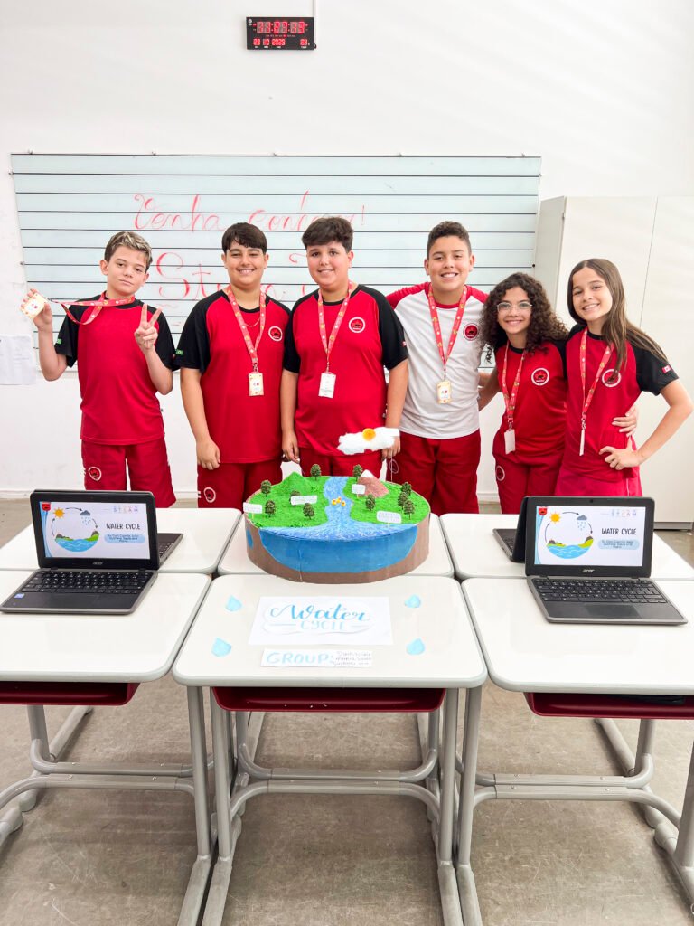 A STEAM FAIR da Maple Bear Cachoeiro reuniu projetos de Ciências, Tecnologia, Arte e Matemática feitos pelos alunos ao longo do ano. Foi um circuito simples de visitar, com as famílias circulando pelas salas e ouvindo os estudantes explicarem, em português e inglês, o que pesquisaram e o que conseguiram construir.